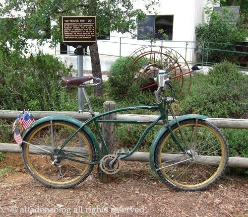 The Henninger family attended a ceremony at Henninger Flats to recognize the100th anniversary of the LA County FIre Forestry Division. 1. The descendants of the Henninger family. 2. From left, Chief Mike Takeshita, Ranger Johann Loockhard, Alana Longoria, James Aguirre, Tim Murphy and Chief Frank Vidales 3. From the left, Takeshita, Aguire, Chief Frank Vidales, and Deputy Jose Martinez present the plaque. 4. The plaque commemorating the fire division 5. Correspondent TIm Murphy’s 50-lb. 1950 vintage Schwinn bicycle made it up the hill. Note the modification on the handlebars for the beverage of your choice.