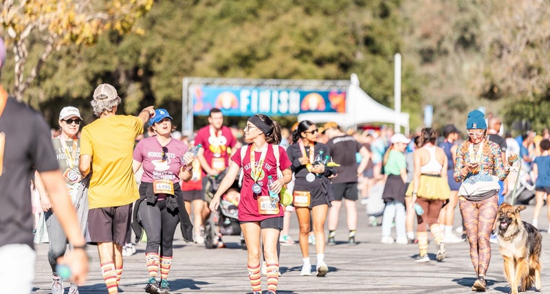 The Thursday sent participants on a 3.1-mile loop past Brookside Golf Course with the San Gabriel Mountains rising under clear morning skies. Arches, cones, and branded banners marked the route around the stadium.