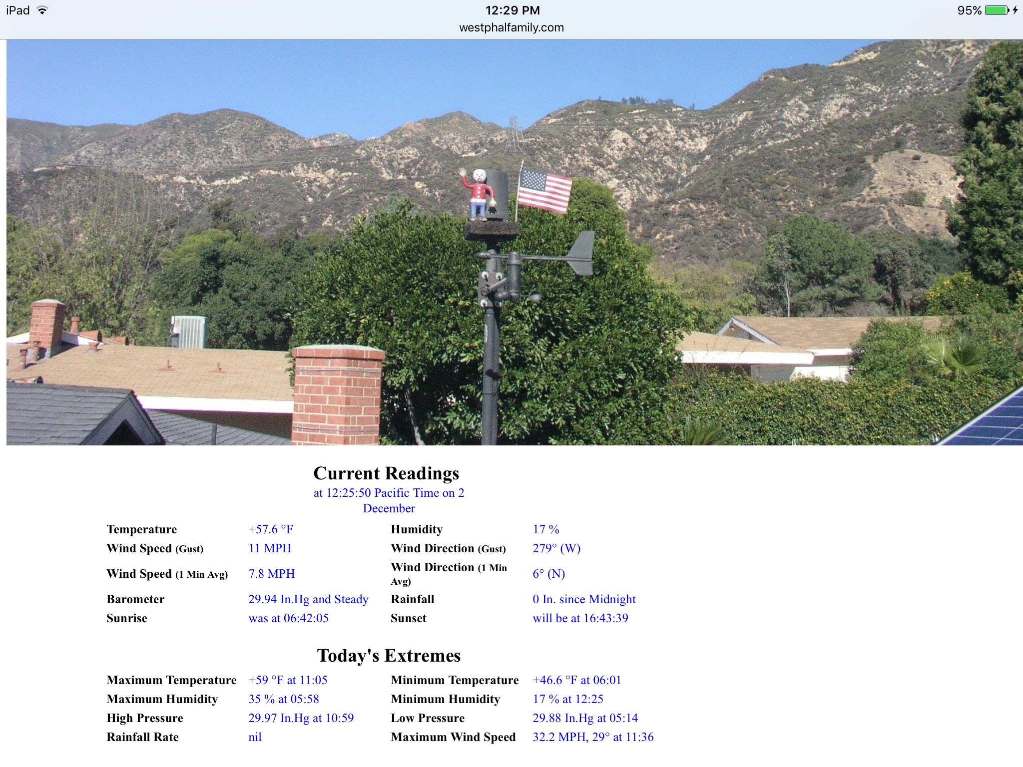 Winds have topped 32 MPH here in Altadena and we have had some power lines fall onto a metal fence off of Lake Ave. Other than lots of trash cans and debris on the road, we have been free from major damage to Altadena. Thanks for the local weather info Bill, http://www.westphalfamily.com/wxdata2.html