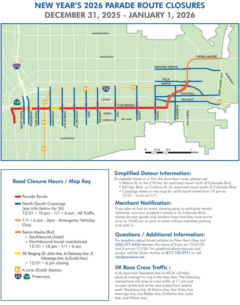 For questions about towed vehicles on New Year’s Day, call (626) 577-6426 between 5 p.m. Dec. 31 and 6 p.m. Jan. 1. For closure and access questions, call the Visitor Hotline at (877) 793-9911 or visit cityofpasadena.net.